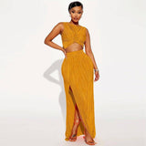 Vestido de gaze plissado de cintura alta e costas abertas