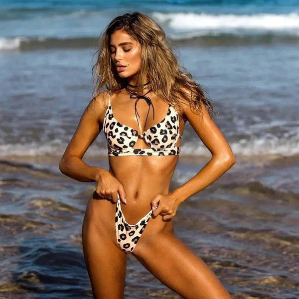 - Corte: Biquíni de duas peças, com parte superior e inferior triangulares clássicas