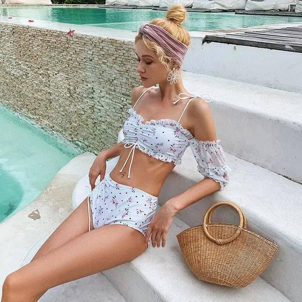 Descrição do produto: Biquíni estampado de bolinhas com babados e cordão