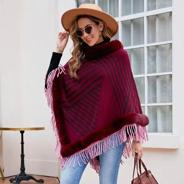 Drizzling Fur Collar Pullover Tassel Knitted Cape For Women (Capa de malha com gola de pele)