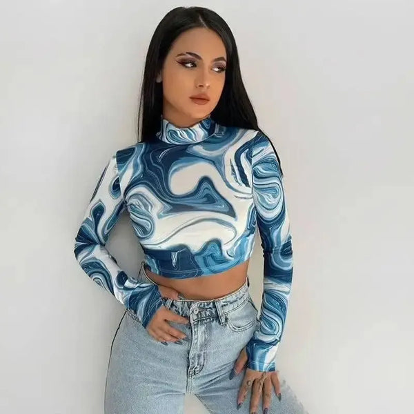 Estampado Meia gola alta Pullover Crop Finger Sleeve Top