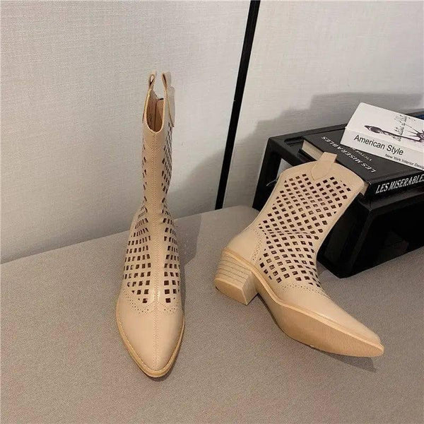 Apontado Western Cowboy Boots Mulheres Thin Hollow Knight Thick