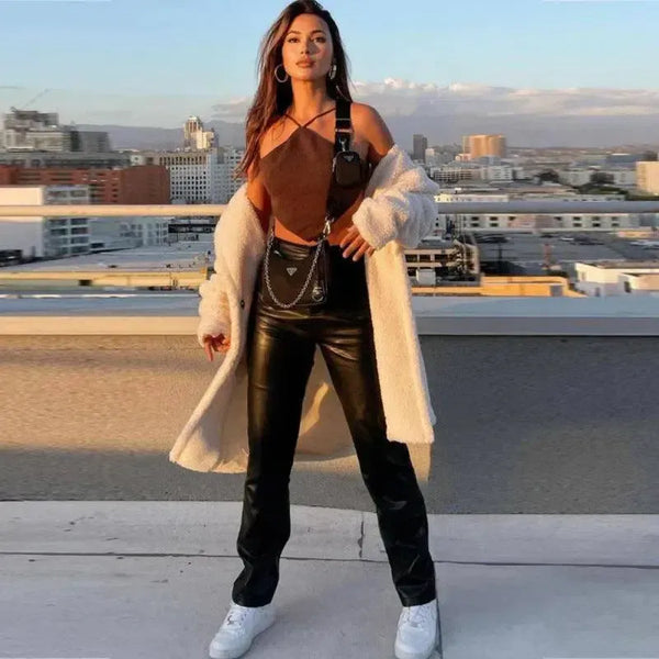 Calças de couro esticadas Calças de couro PU casuais femininas Calças