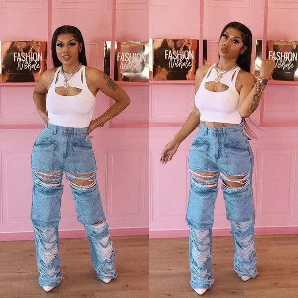 - Estilo: Jeans rasgado reto com zíper de cintura alta para mulheres