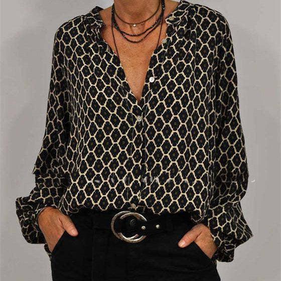 Camiseta feminina com decote em V e manga longa com estampa de moda