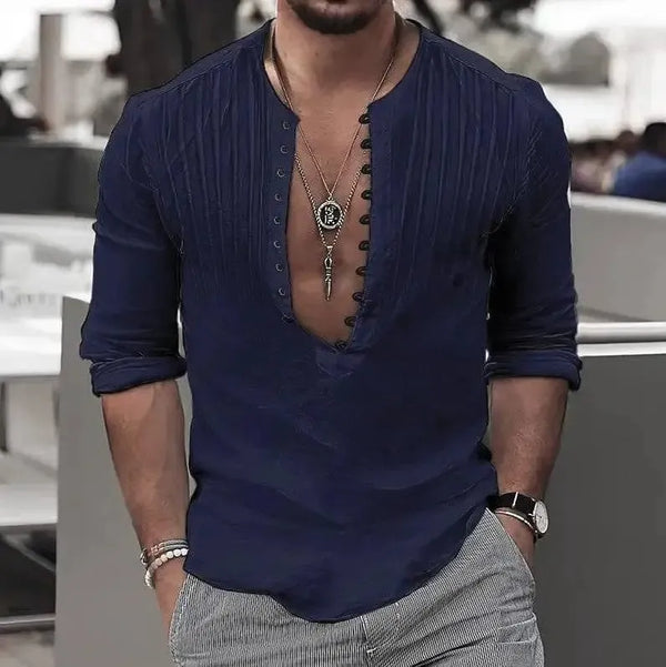Camisa masculina casual solta com botões de algodão e gola redonda