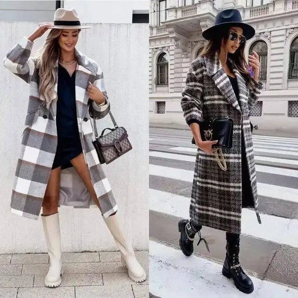 Casaco xadrez de comprimento médio com gravata e lapela Casaco de lã