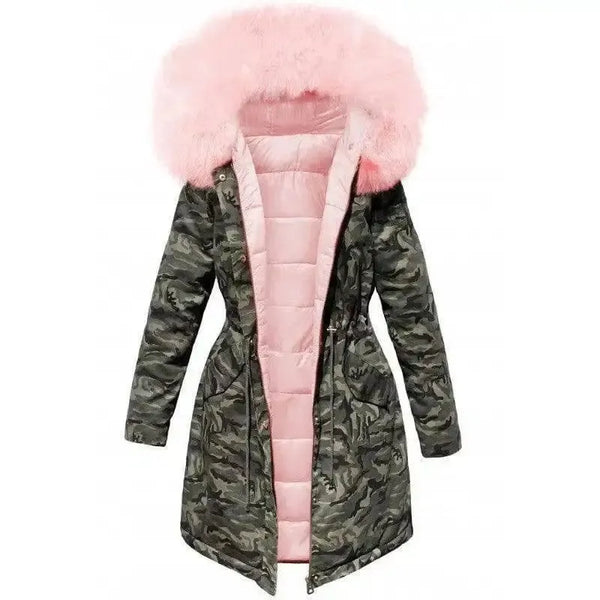 Casaco de pelúcia grosso, solto, com gola de pele grande e comprimento médio, camuflado