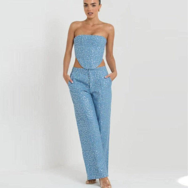 - Tipo de produto: Top de tubo com lantejoulas em jeans e terno de calça de perna larga