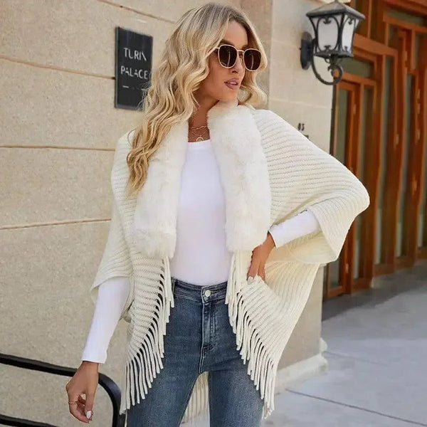 Xale de malha com gola de pele e borla para mulheres