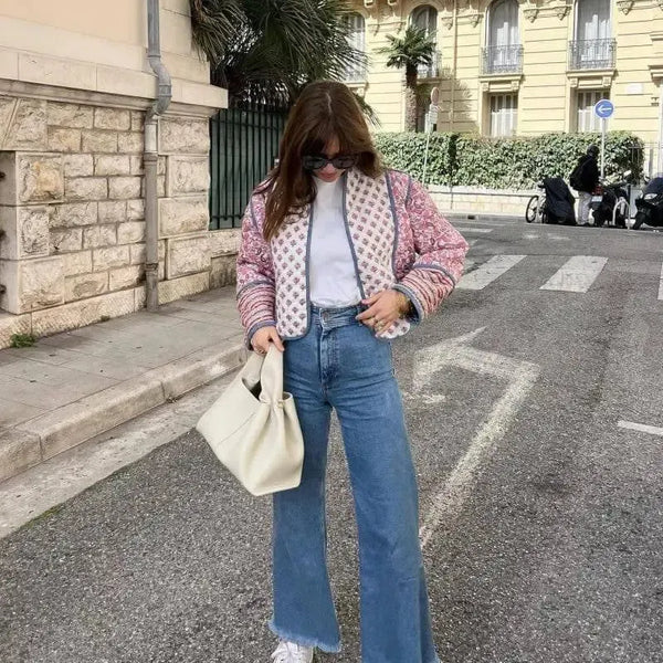 Moda feminina com gola alta, solta e acolchoada em dois lados