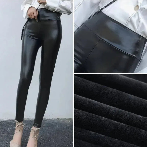 Calça de couro Calça feminina grossa de cintura alta de couro PU de tamanho grande