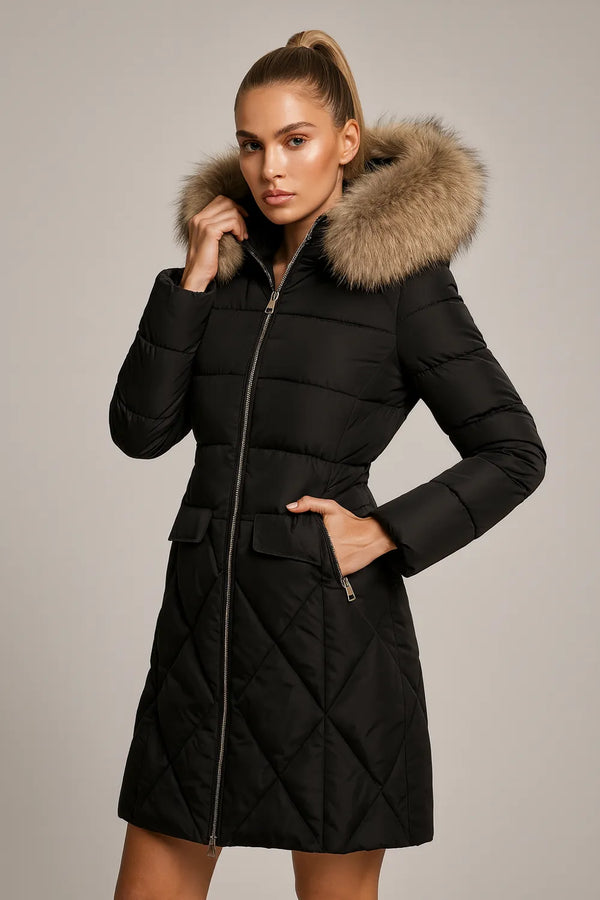 - Estilo do decote/ombro: Com capuz e acabamento em pele sintética
