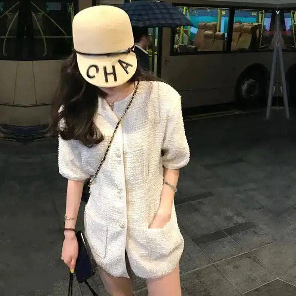 Conjunto de jaqueta e bermuda de tweed para mulheres