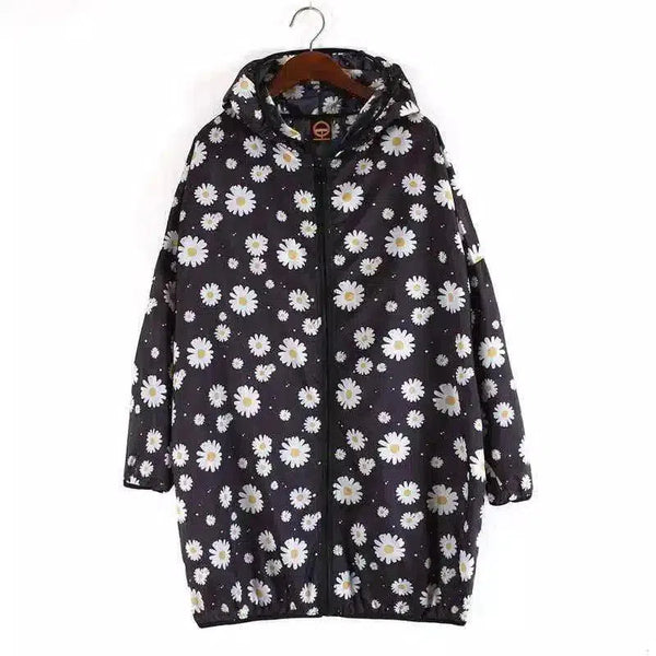 - Padrão de margarida encantador: A jaqueta apresenta uma estampa de margarida encantadora e atraente em um fundo escuro, proporcionando um equilíbrio perfeito entre estilo ousado e feminino.