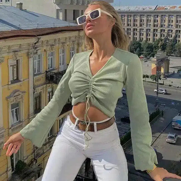 Blusa feminina com decote em V e amarração na frente