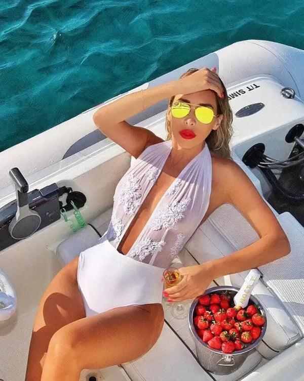 Descrição do produto: Biquíni Siamês Bordado Halter Lingerie