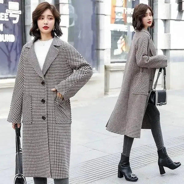 Casaco de inverno feminino com bolsos e estampa de dentes de galinha