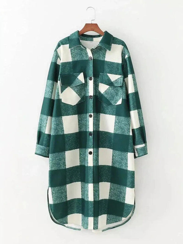 - Detalhes do design: Padrão xadrez em verde e branco ousado, dois bolsos no peito com abas, fechamento frontal com botões