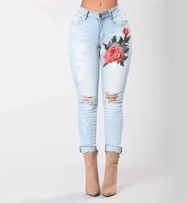 Calça Jeans Feminina Fashion Hole Embroidered High-elastic