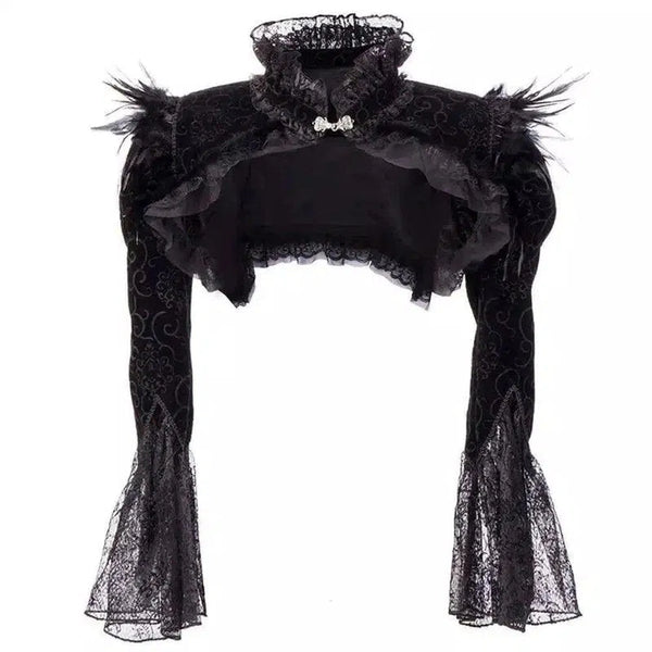 - Estilo do decote ou do ombro: Gola alta de renda com acabamento de plumas