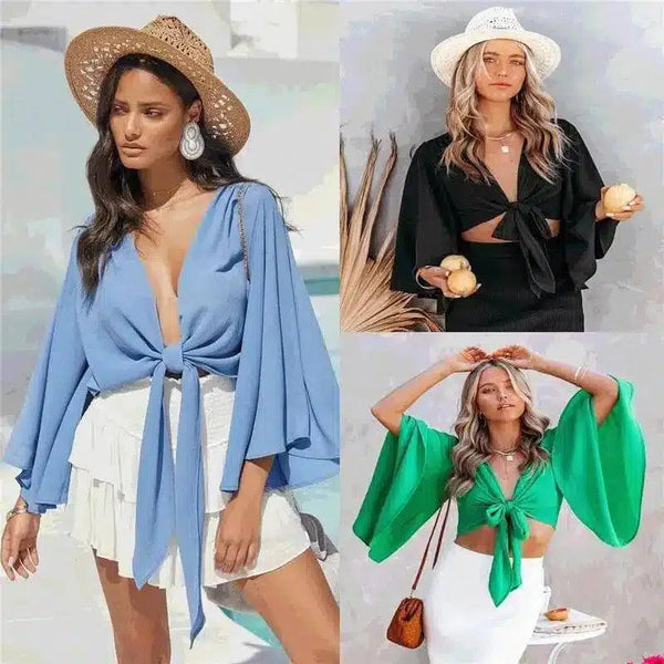 Top feminino com frente amarrada e mangas largas