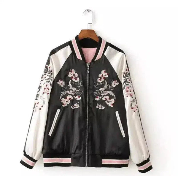 - Detalhes adicionais: Fechamento frontal com zíper, punhos e bainha com nervuras, bolsos laterais com fechamento com zíper, design floral bordado na frente e nas mangas