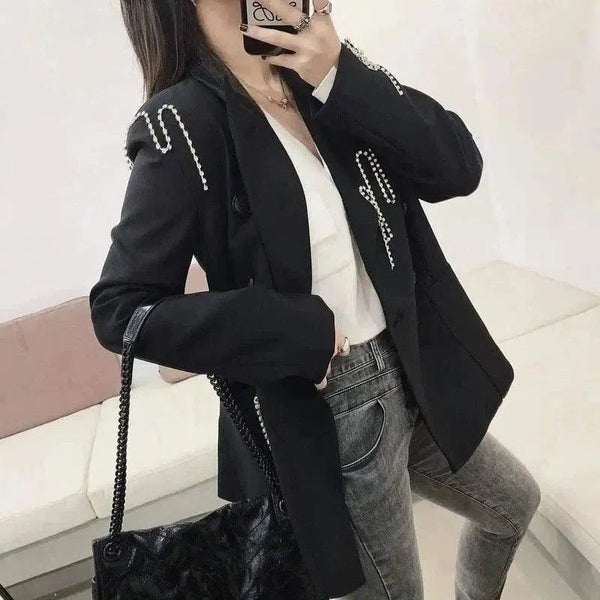 - Detalhes requintados de pérolas: O blazer apresenta elegantes enfeites de pérolas ao longo das lapelas, bolsos e mangas, acrescentando um toque de luxo e feminilidade ao design clássico.