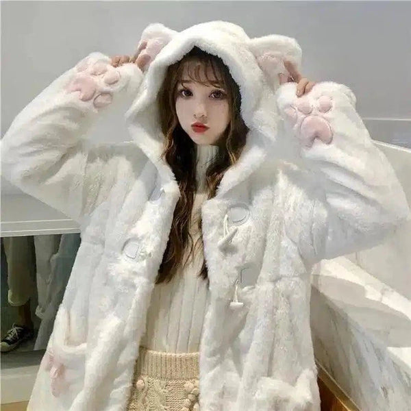 Casaco acolchoado de algodão com capuz e orelhas de gato fofas para mulheres