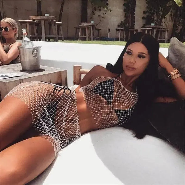 Descrição do produto: Fato de banho brilhante com diamante quente e rede de pesca tecida à mão