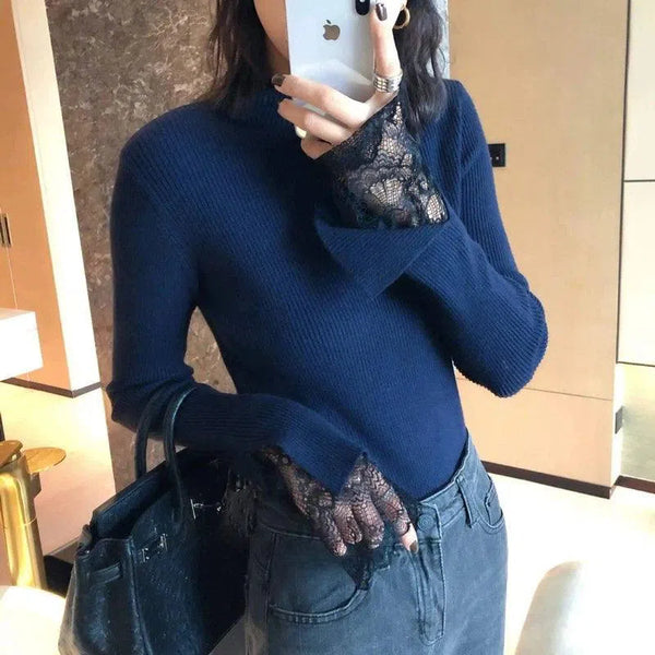 Suéter de gola alta com nervuras e punho de renda