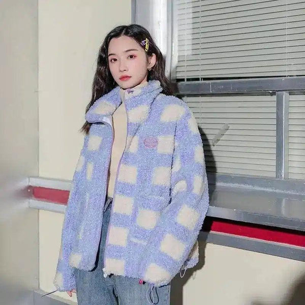 Jaqueta feminina xadrez de lã quente com veludo falso de cordeiro
