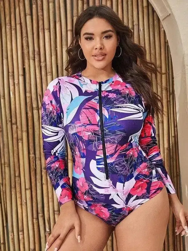 Maiô feminino plus size de uma peça, estampado de manga longa