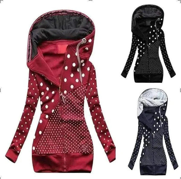 - Opções de cores fortes: Disponível em opções de cores marcantes, cada moletom com capuz é adornado com bolinhas brancas nítidas que se destacam contra o fundo vibrante.