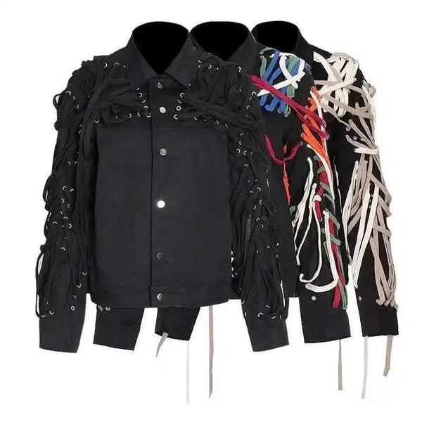 - Características adicionais: Fechamento frontal com botões, mangas e ombros com cadarços e detalhes multicoloridos