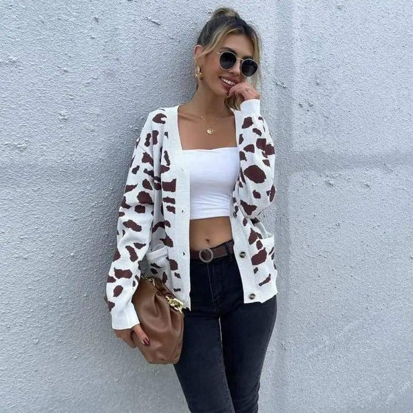 Casaco de suéter tricotado com gola em V com estampa de leopardo