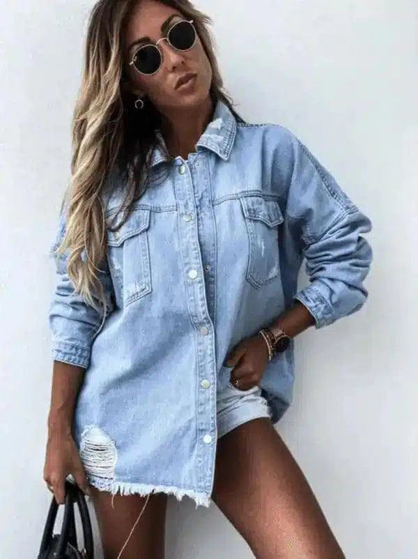 - Características adicionais: Dois bolsos no peito com abas de botão; detalhes desgastados na bainha