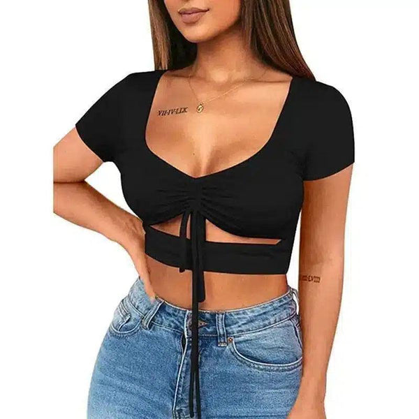 Top cropped com frente amarrada e mangas curtas