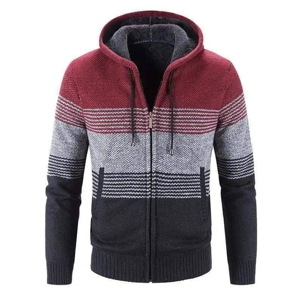 Casaco masculino com capuz e listras Cardigã masculino de lã com zíper grosso
