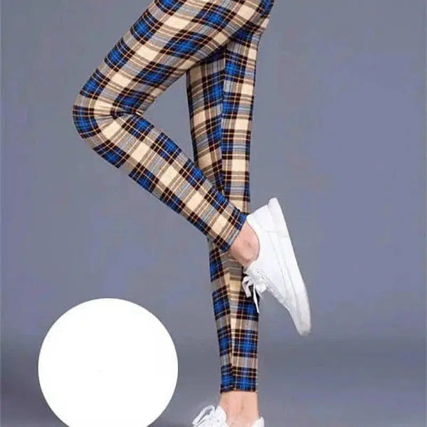 - Padrão: Estampa xadrez clássica em bege, azul e preto