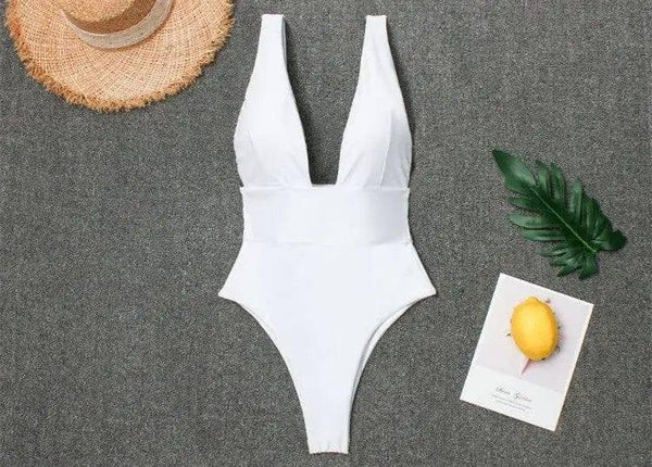Uma peça feminina com decote em V, costas vazadas e cintura alta