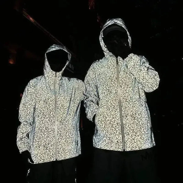 - Material refletivo que chama a atenção: essas jaquetas são fabricadas com um material refletivo de alta visibilidade que brilha intensamente sob a luz, perfeito para a segurança noturna e para se destacar na moda streetwear.