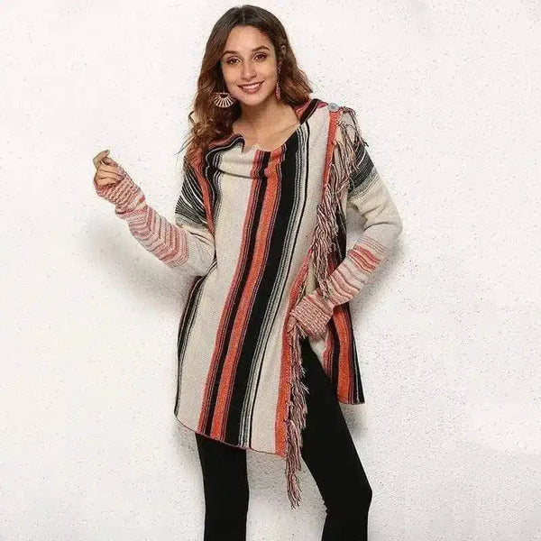 - Detalhes adicionais: Bainha assimétrica com detalhes em franja; padrão listrado ousado em tons neutros e quentes