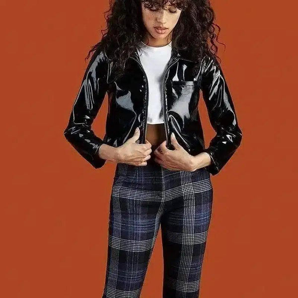 Jaqueta curta de couro com pintura preta brilhante