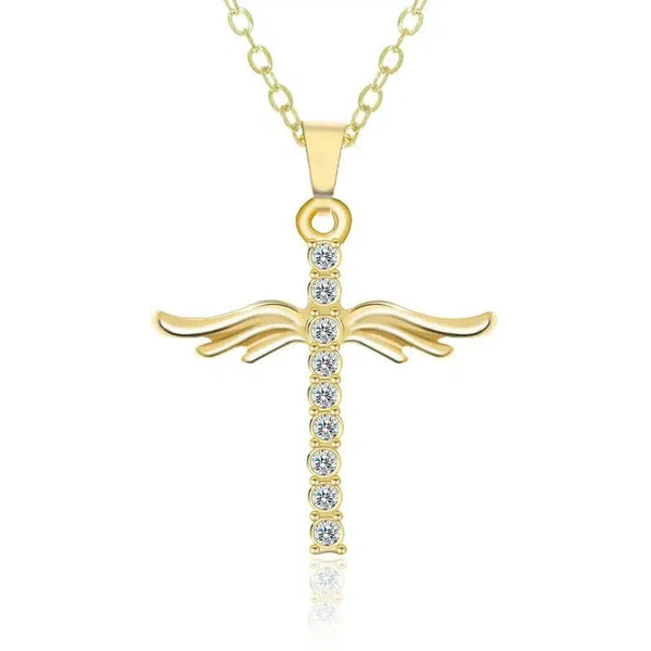 - Design: Pingente de cruz simples com asas de anjo com design intrincado