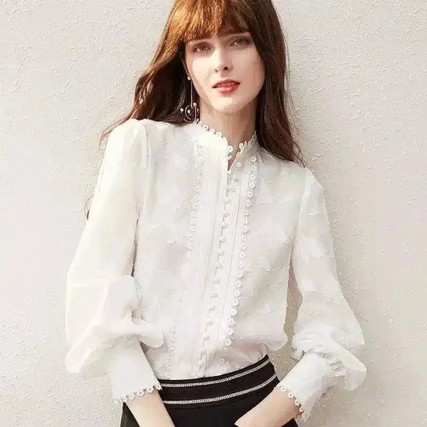 - Bordas recortadas delicadas - As mangas e a gola têm acabamento com bordas recortadas, contribuindo para o visual intrincado e polido da blusa.