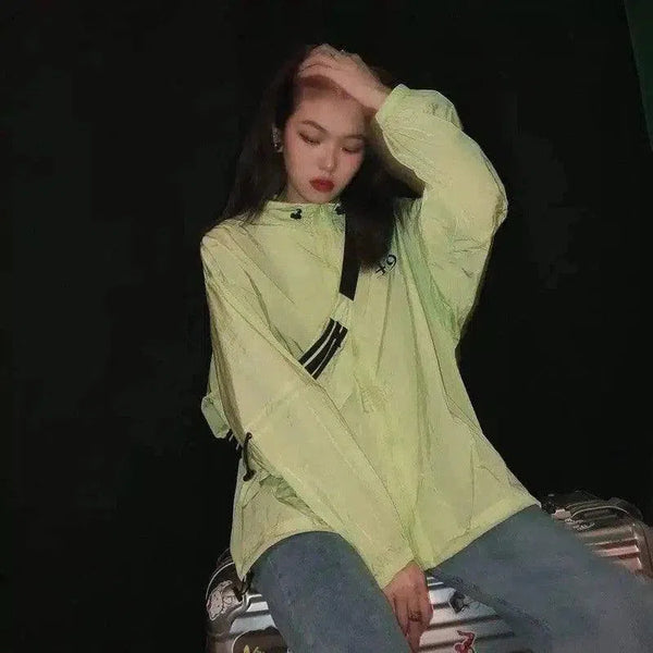 Cor neon que chama a atenção: Faça uma declaração ousada com a tonalidade neon vibrante da jaqueta, uma escolha moderna que se destaca em qualquer ambiente.