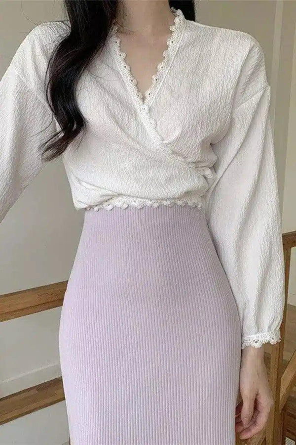 Blusa com decote em V com acabamento em renda e saia lápis de malha