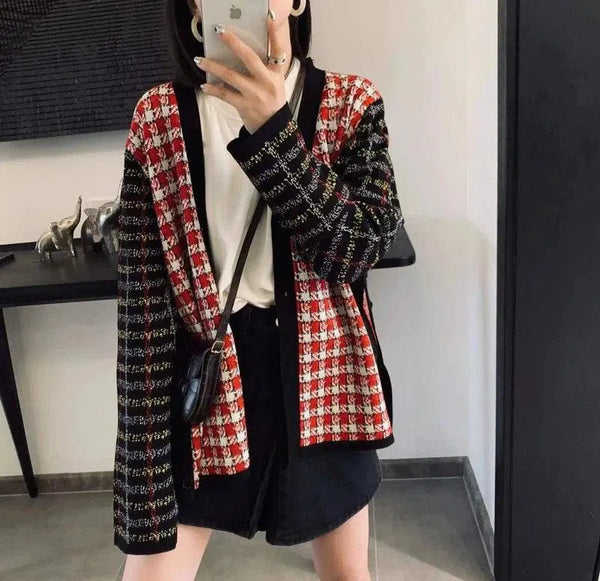 - Design de padrão intrincado: O blazer apresenta um padrão clássico de houndstooth em vermelho e preto, intercalado com fios metálicos sutis para um toque de brilho e glamour.