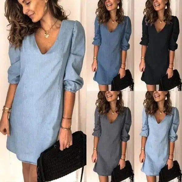 Vestido casual solto de algodão e linho com decote em V e manga curta